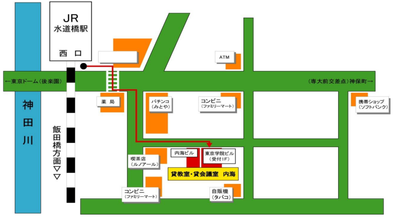 会場となる東京学院ビル(千代田区神田三崎町3-6-15)は、JR総武線「水道橋西口(新宿寄り出口)」徒歩1分です。会場にはエレベーターはございません。あらかじめご了承下さい。